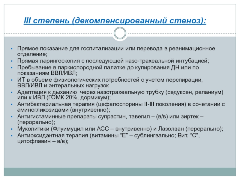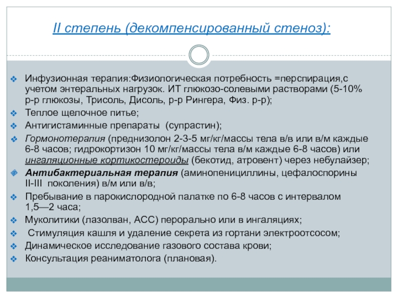 Гормонотерапия (преднизолон 2-3-5 мг/кг/массы тела в/в или в/м каждые 6-8 часов; гидрокортизон 10 мг/кг/массы тела в/м каждые 6-8 часов) или ингаляционные кортикостероиды (бекотид, атровент) через небулайзер;