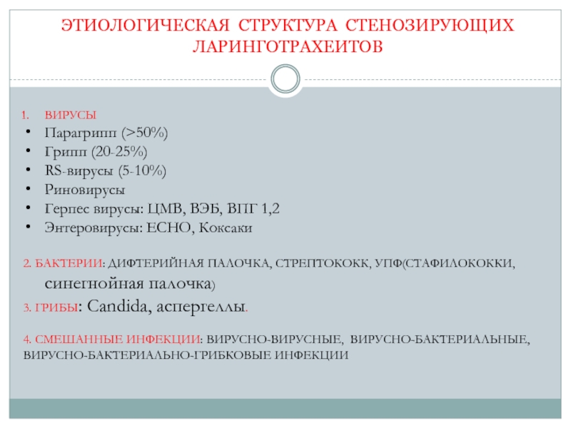 Слайд 5ЭТИОЛОГИЧЕСКАЯ СТРУКТУРА СТЕНОЗИРУЮЩИХ ЛАРИНГОТРАХЕИТОВ