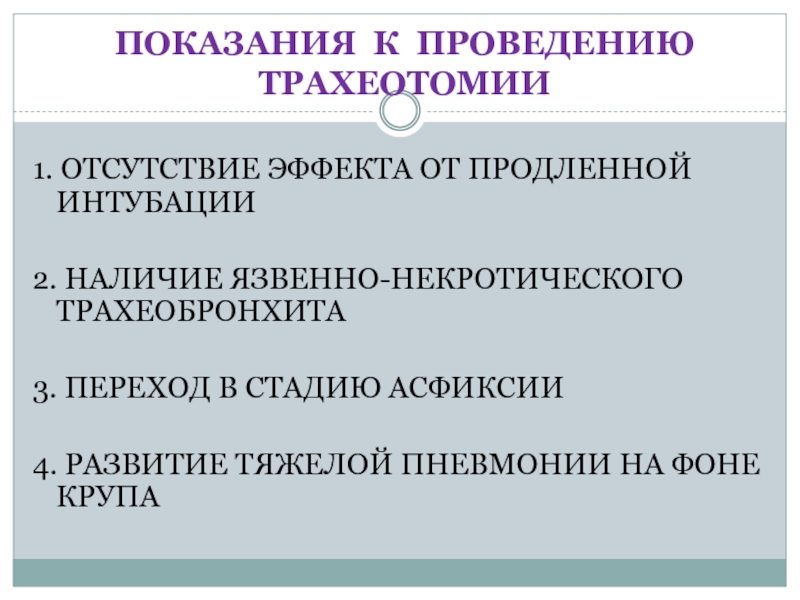 Слайд 24ПОКАЗАНИЯ К ПРОВЕДЕНИЮ ТРАХЕОТОМИИ