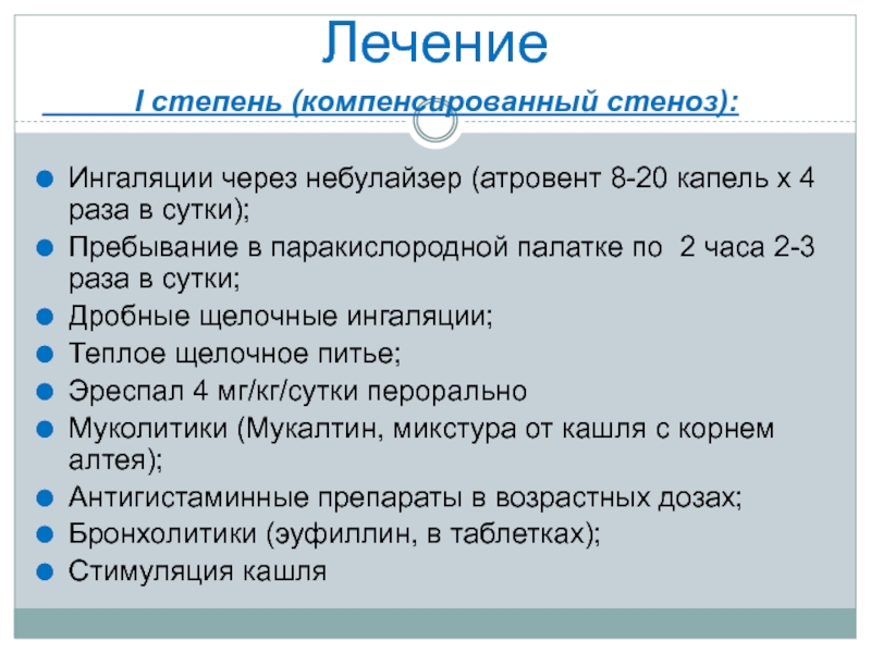 Гормонотерапия (преднизолон 2-3-5 мг/кг/массы тела в/в или в/м каждые 6-8 часов; гидрокортизон 10 мг/кг/массы тела в/м каждые 6-8 часов) или ингаляционные кортикостероиды (бекотид, атровент) через небулайзер;