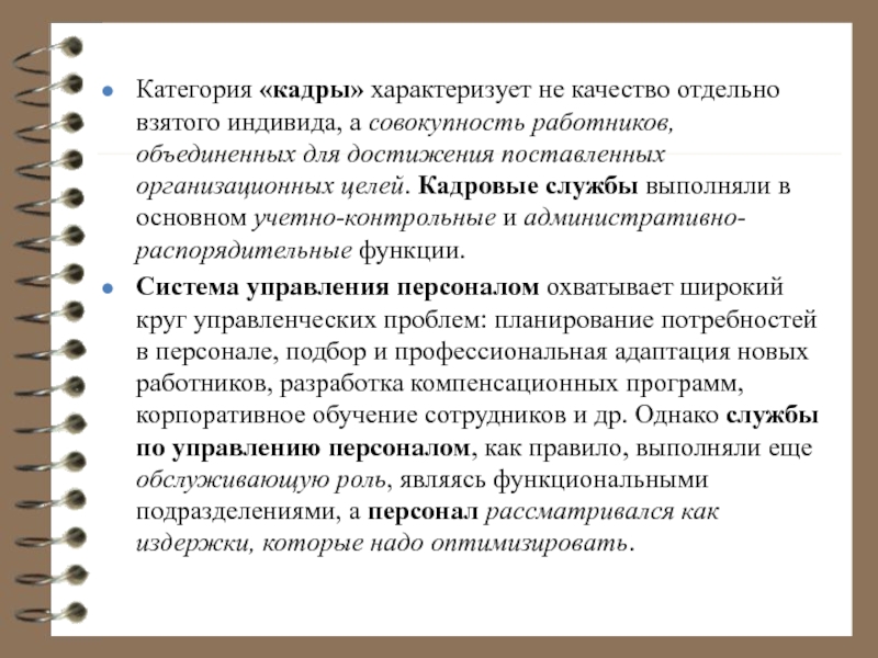 Система управления персоналом охватывает широкий круг управленческих проблем: планирование потребностей в персонале, подбор и профессиональная адаптация новых работников, разработка компенсационных программ, корпоративное обучение сотрудников и др. Однако службы по управлению персоналом, как правило, выполняли еще обслуживающую роль, являясь функциональными подразделениями, а персонал рассматривался как издержки, которые надо оптимизировать.