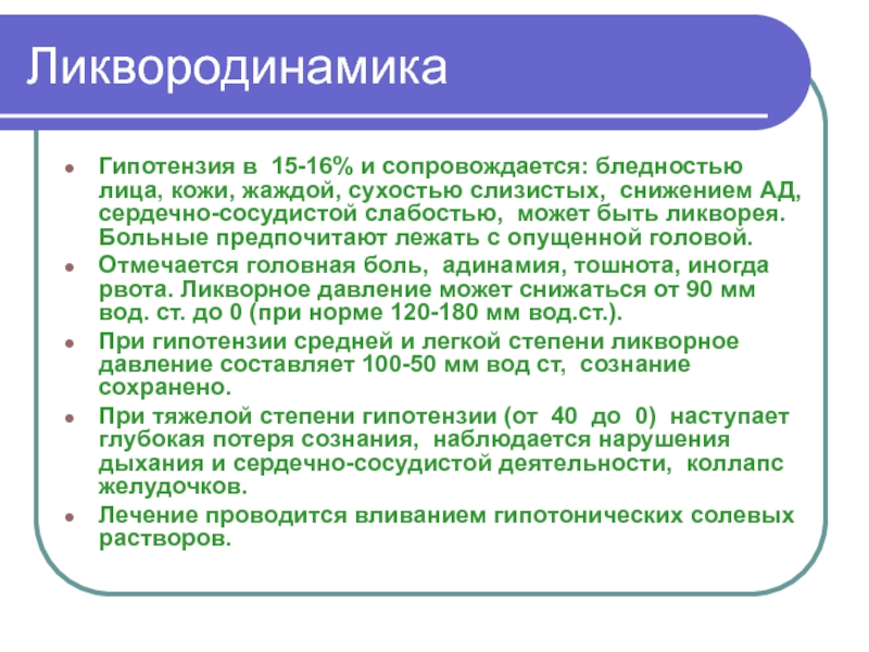 в ушах, приливы крови к лицу, потливость, нарушение сна. Легкие оболочечные симптомы. Давление ликвора без существенных изменений. Состояние улучшается в течение первых двух недель.