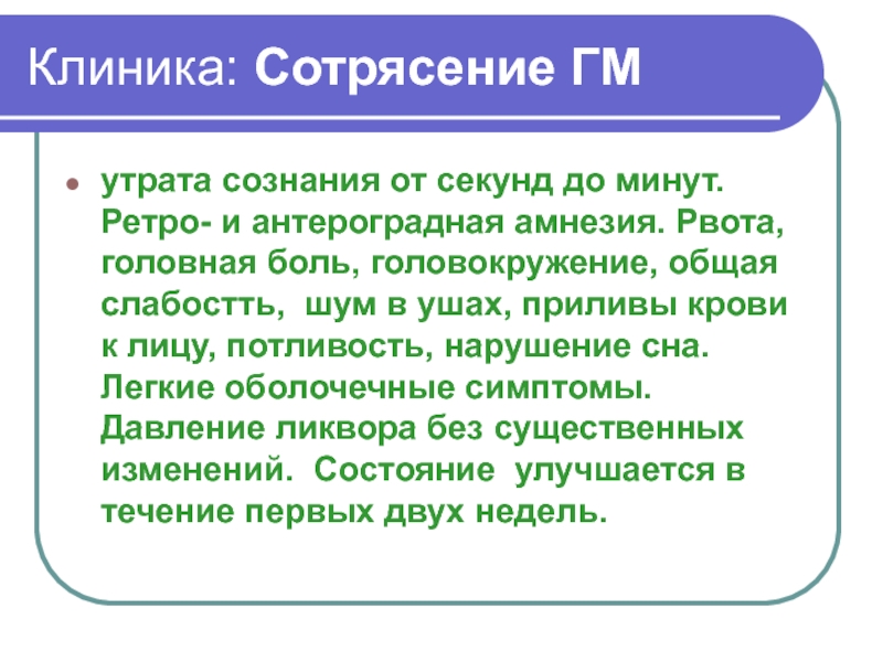 и антероградная амнезия. Рвота, головная боль, головокружение, общая слабостть, шум
