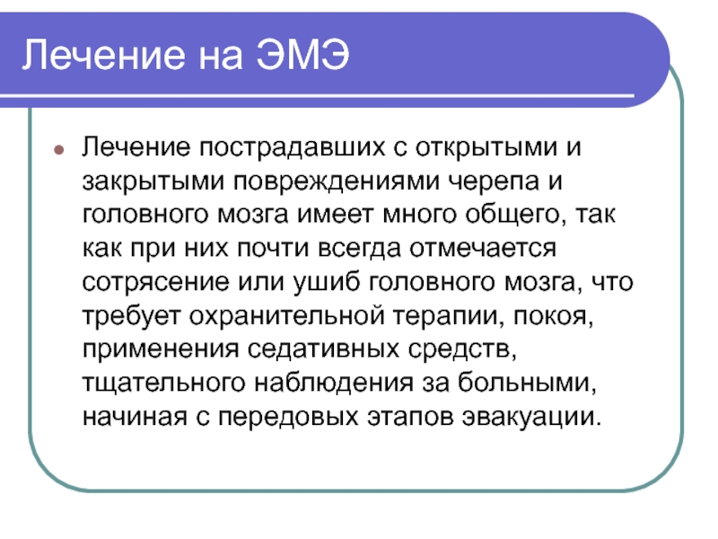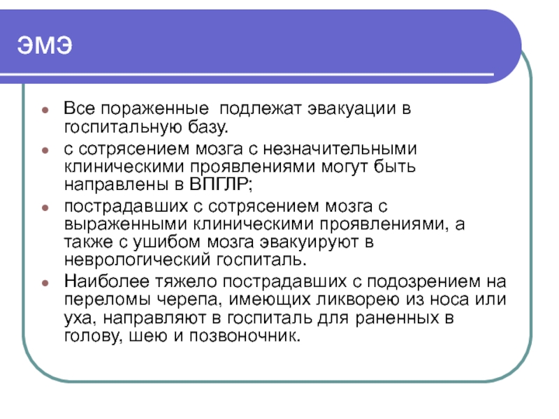 сотрясением мозга с выраженными клиническими проявлениями, а также с ушибом мозга эвакуируют в неврологический госпиталь.