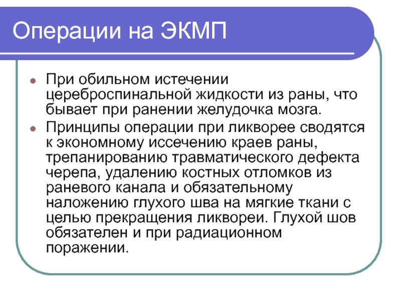 экономному иссечению краев раны, трепанированию травматического дефекта черепа, удалению костных отломков из раневого канала и обязательному наложению глухого шва на мягкие ткани с целью прекращения ликвореи. Глухой шов обязателен и при радиационном поражении.