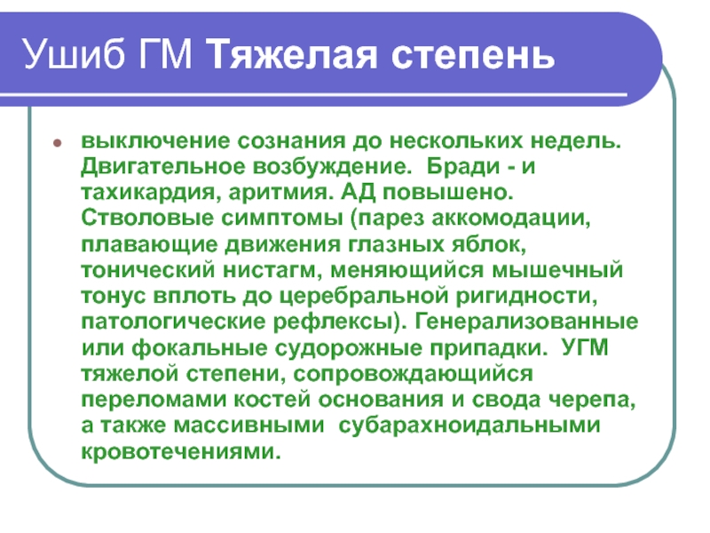 симптомы (парез аккомодации, плавающие движения глазных яблок, тонический нистагм, меняющийся мышечный тонус вплоть до церебральной ригидности, патологические рефлексы). Генерализованные или фокальные судорожные припадки. УГМ тяжелой степени, сопровождающийся переломами костей основания и свода черепа, а также массивными субарахноидальными кровотечениями.
