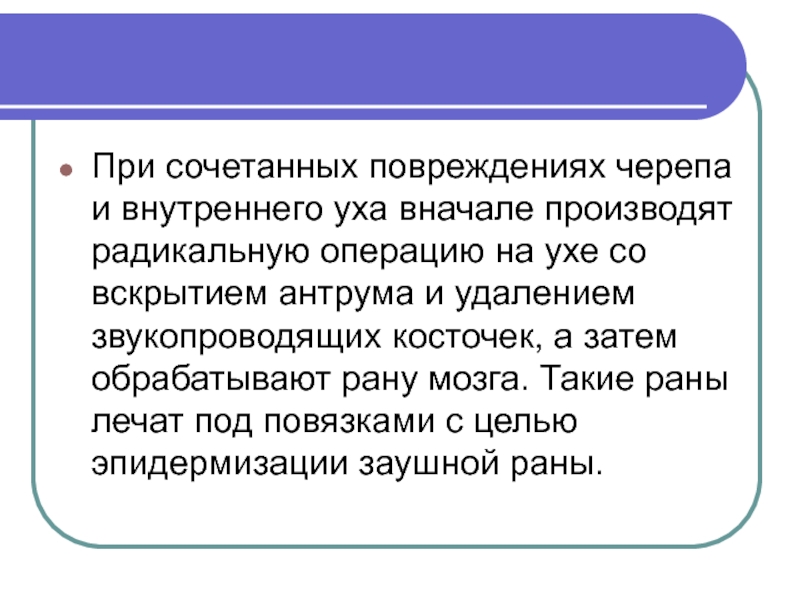 Слайд 52При сочетанных повреждениях черепа и внутреннего уха вначале производят радикальную