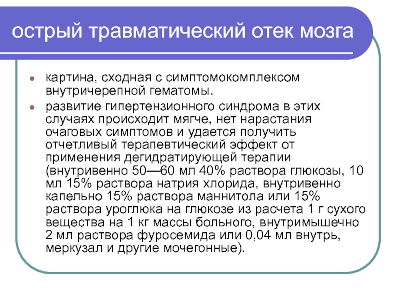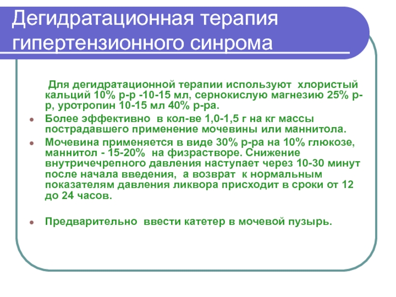 и удается получить отчетливый терапевтический эффект от применения дегидратирующей терапии (внутривенно 50—60 мл 40% раствора глюкозы, 10 мл 15% раствора натрия хлорида, внутривенно капельно 15% раствора маннитола или 15% раствора уроглюка на глюкозе из расчета 1 г сухого вещества на 1 кг массы больного, внутримышечно 2 мл раствора фуросемида или 0,04 мл внутрь, меркузал и другие мочегонные).