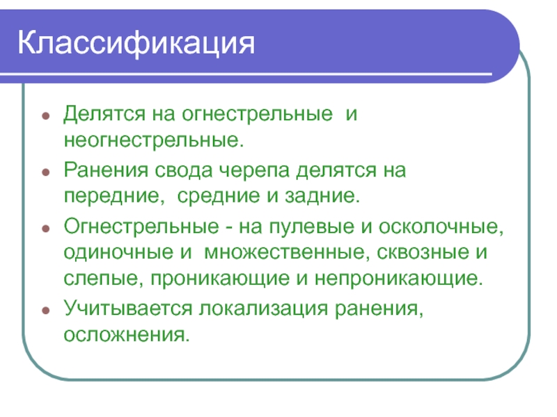 Огнестрельные - на пулевые и осколочные, одиночные и