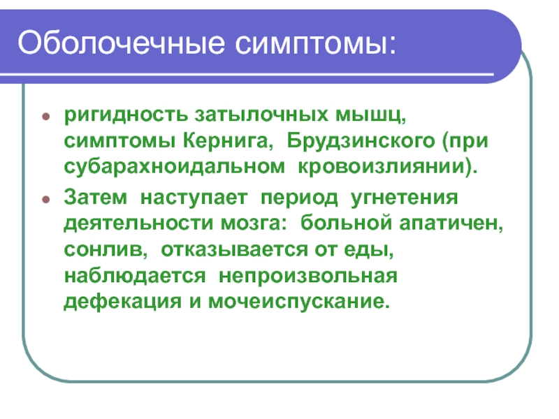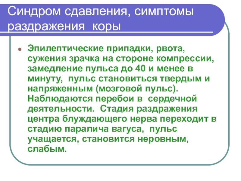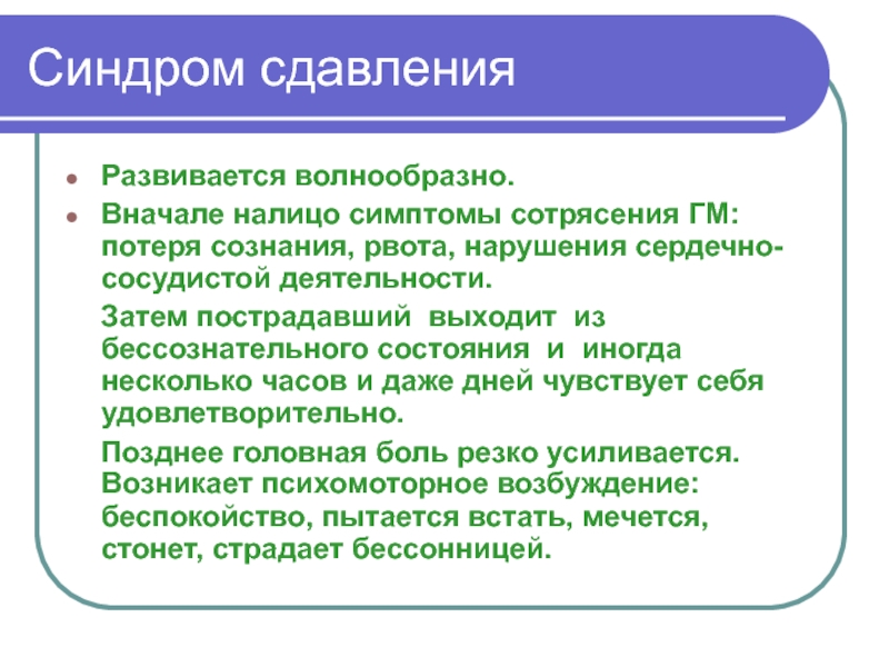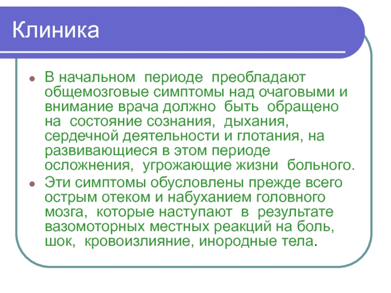 Эти симптомы обусловлены прежде всего острым отеком и набуханием головного мозга, которые наступают в результате вазомоторных местных реакций на боль, шок, кровоизлияние, инородные тела.