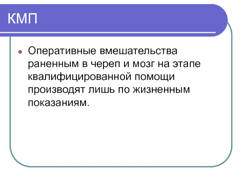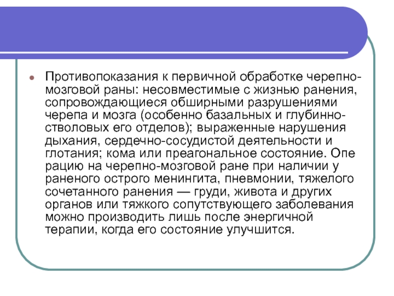 Слайд 47Противопоказания к первичной обработке черепно-мозговой раны: несовместимые с жизнью ранения,