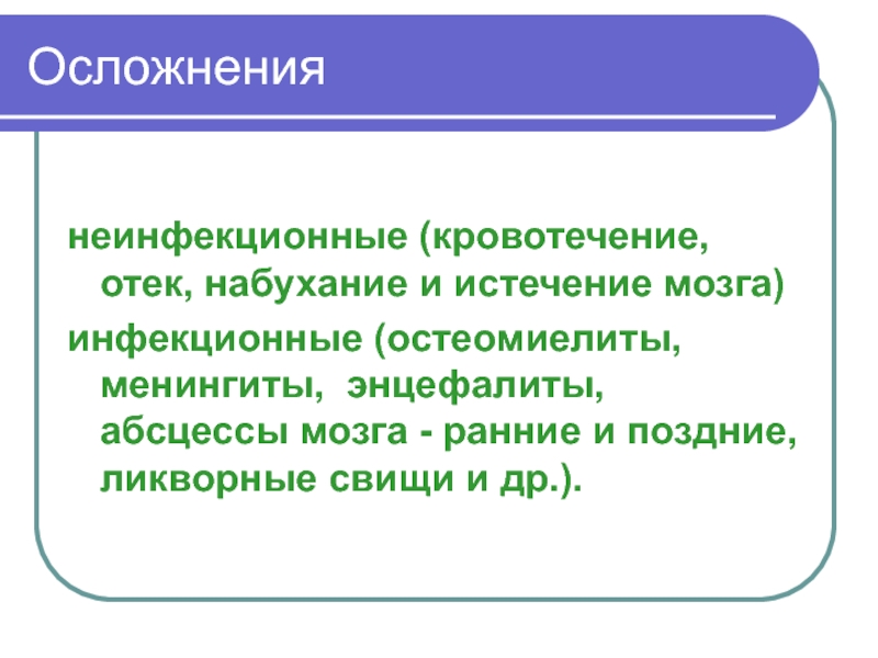 абсцессы мозга - ранние и поздние, ликворные свищи и др.).