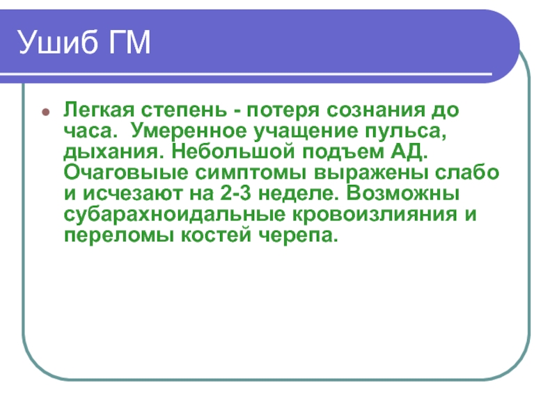 Легкая степень - сотрясение и ушиб ГМ легкой степени;