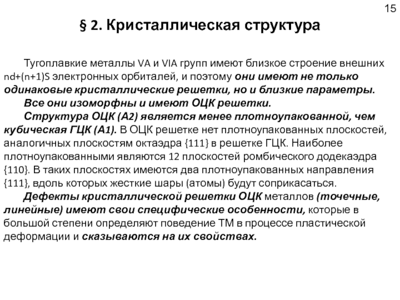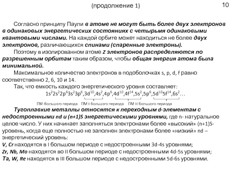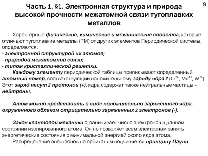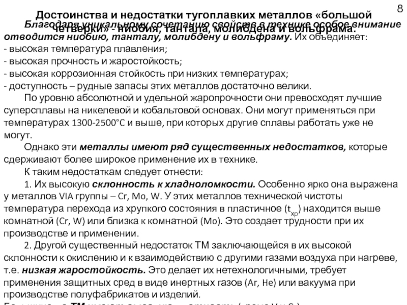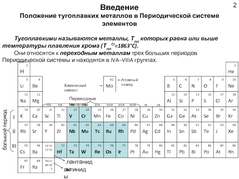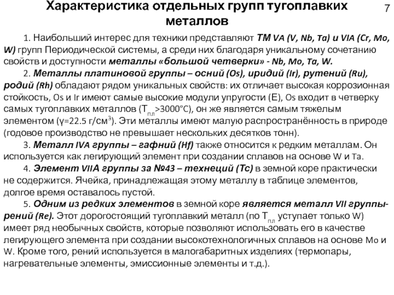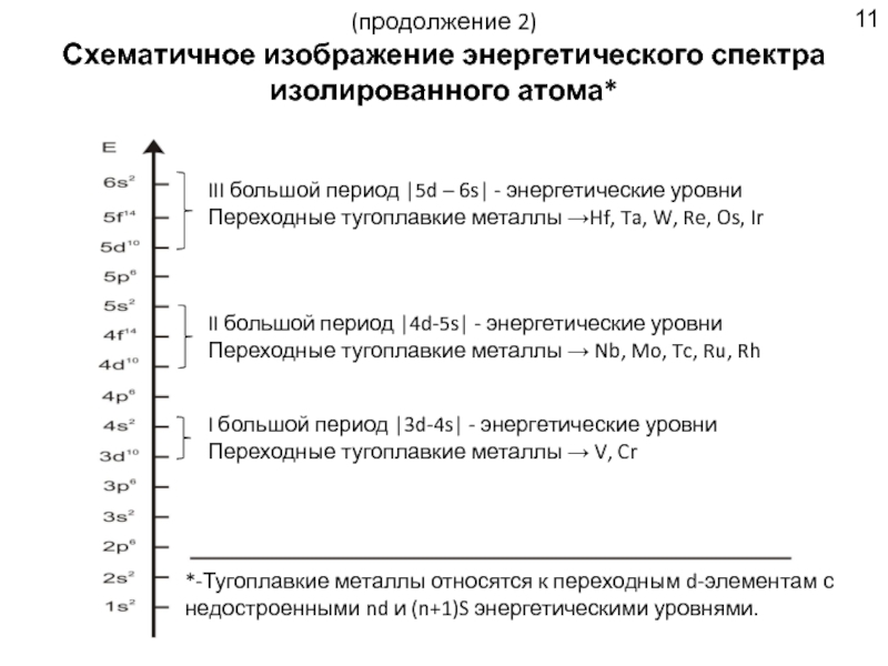 Тугоплавкие металлы относятся к переходным d-элементам с недостроенными nd и (n+1)S энергетическими уровнями, где n- натуральное целое число. У них начинает заполняться электронами более «высокий» (n+1)S-уровень, когда еще полностью не заполнен электронами более «низкий» nd – энергетический уровень:
