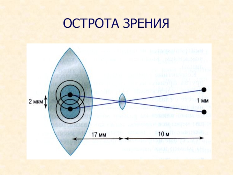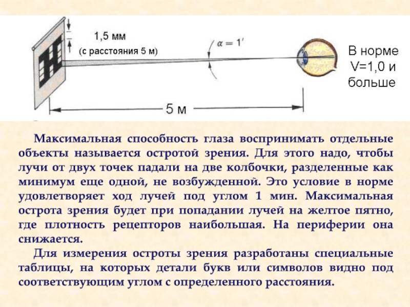 Слайд 21Максимальная способность глаза воспринимать отдельные объекты называется остротой зрения. Для