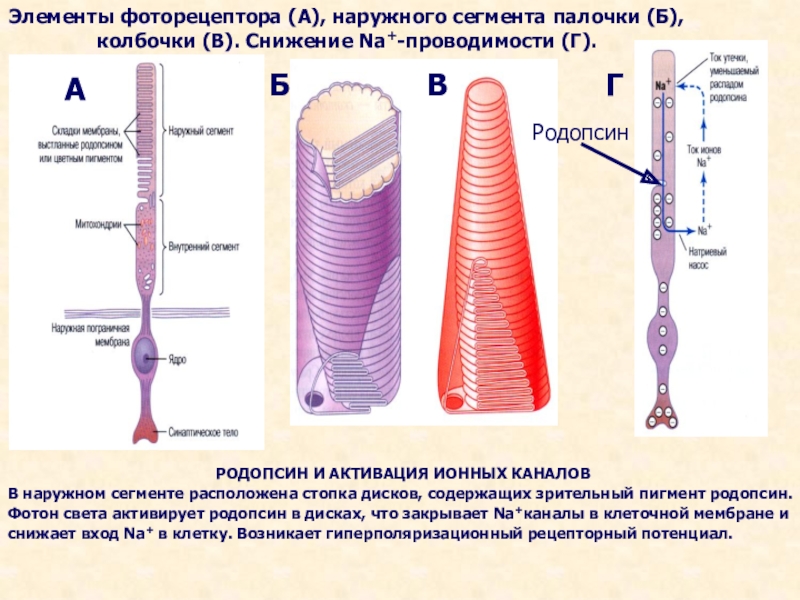 Слайд 27Элементы фоторецептора (А), наружного сегмента палочки (Б), колбочки (В). Снижение