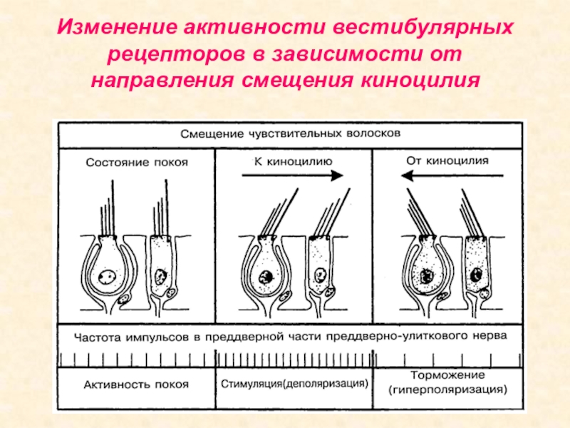 Слайд 10Изменение активности вестибулярных рецепторов в зависимости от направления смещения киноцилия