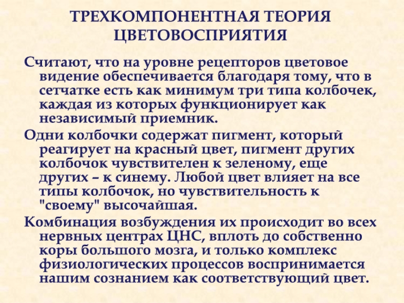 Комбинация возбуждения их происходит во всех нервных центрах ЦНС, вплоть до собственно коры большого мозга, и только комплекс физиологических процессов воспринимается нашим сознанием как соответствующий цвет.