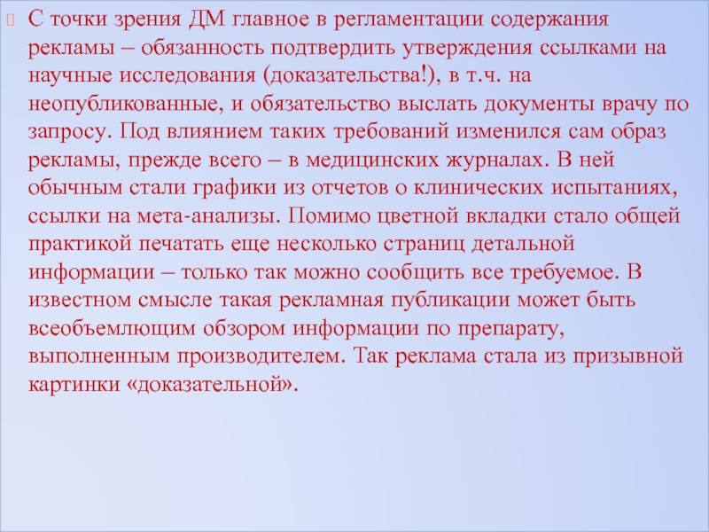 на неопубликованные, и обязательство выслать документы врачу по запросу. Под влиянием таких требований изменился сам образ рекламы, прежде всего – в медицинских журналах. В ней обычным стали графики из отчетов о клинических испытаниях, ссылки на мета-анализы. Помимо цветной вкладки стало общей практикой печатать еще несколько страниц детальной информации – только так можно сообщить все требуемое. В известном смысле такая рекламная публикации может быть всеобъемлющим обзором информации по препарату, выполненным производителем. Так реклама стала из призывной картинки «доказательной».