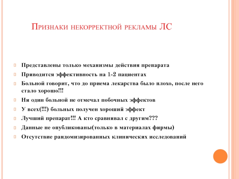 появления перхоти на голове или грибка на ногах, першении в горле и заложенности носа. Рекламируются лекарства, излечивающие все, начиная от насморка и заканчивая сложными кардиологическими заболеваниями, методы лечения которых должен назначать только специалист. Соответственно, и в действии лекарств может разобраться только врач-профессионал.