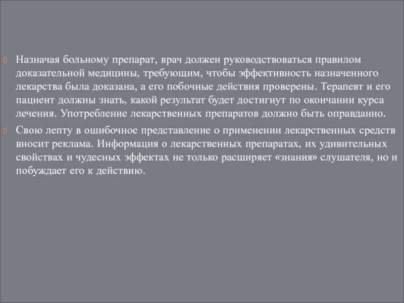 Назначая больному препарат, врач должен руководствоваться правилом доказательной медицины, требующим,