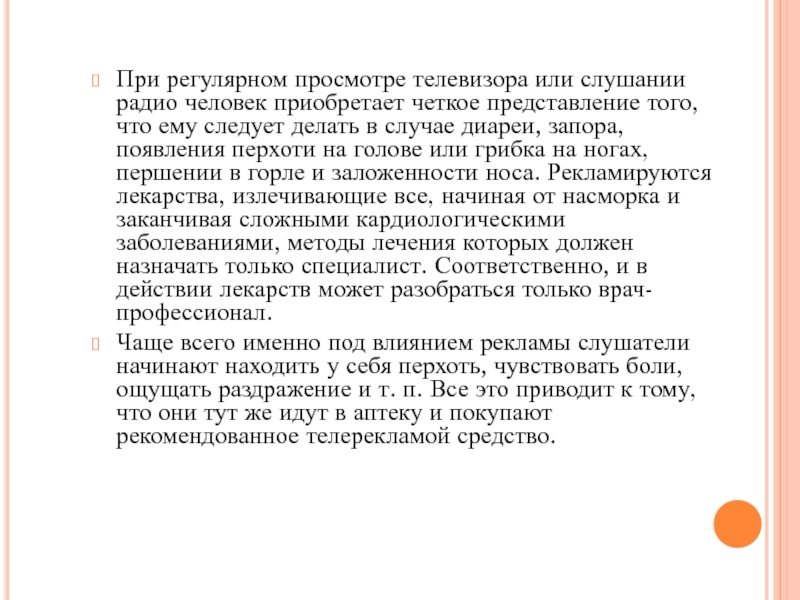 Чаще всего именно под влиянием рекламы слушатели начинают находить у себя перхоть, чувствовать боли, ощущать раздражение и т. п. Все это приводит к тому, что они тут же идут в аптеку и покупают рекомендованное телерекламой средство.