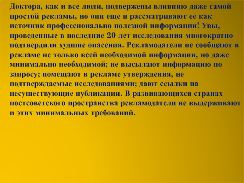 полезной информации! Увы, проведенные в последние 20 лет исследования многократно подтвердили худшие опасения. Рекламодатели не сообщают в рекламе не только всей необходимой информации, но даже минимально необходимой; не высылают информацию по запросу; помещают в рекламе утверждения, не подтверждаемые исследованиями; дают ссылки на несуществующие публикации. В развивающихся странах постсоветского пространства рекламодатели не выдерживают и этих минимальных требований.
