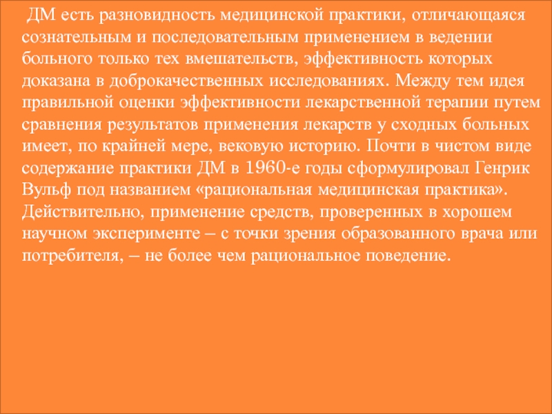 доброкачественных исследованиях. Между тем идея правильной оценки эффективности лекарственной терапии путем сравнения результатов применения лекарств у сходных больных имеет, по крайней мере, вековую историю. Почти в чистом виде содержание практики ДМ в 1960-е годы сформулировал Генрик Вульф под названием «рациональная медицинская практика». Действительно, применение средств, проверенных в хорошем научном эксперименте – с точки зрения образованного врача или потребителя, – не более чем рациональное поведение.