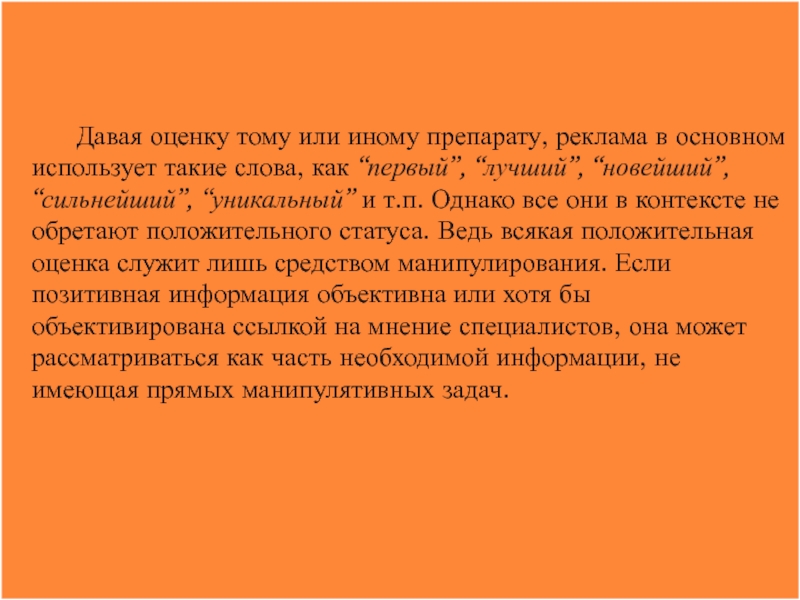 т.п. Однако все они в контексте не обретают положительного статуса. Ведь всякая положительная оценка служит лишь средством манипулирования. Если позитивная информация объективна или хотя бы объективирована ссылкой на мнение специалистов, она может рассматриваться как часть необходимой информации, не имеющая прямых манипулятивных задач.