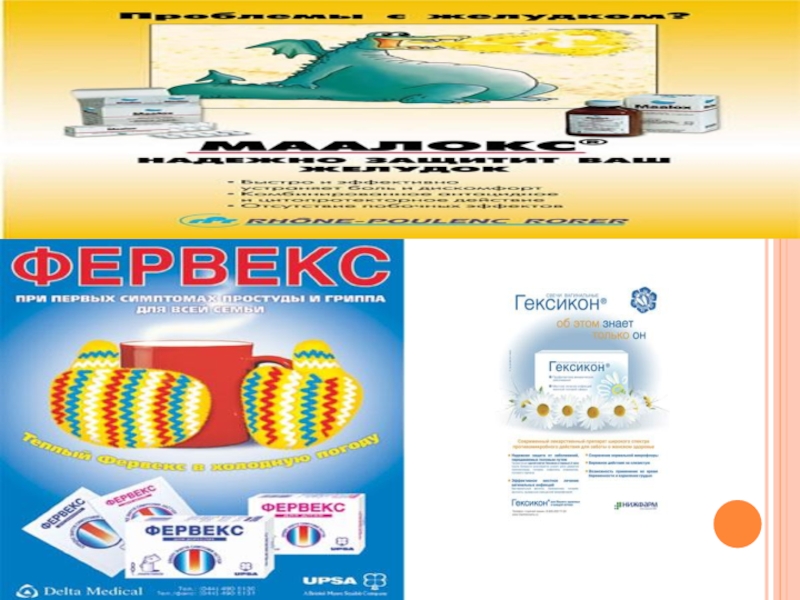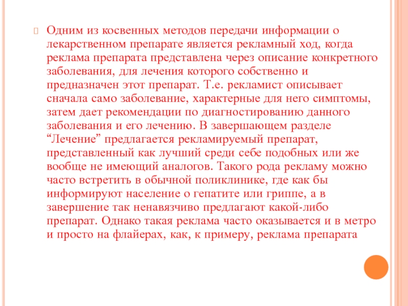 для лечения которого собственно и предназначен этот препарат. Т.е. рекламист описывает сначала само заболевание, характерные для него симптомы, затем дает рекомендации по диагностированию данного заболевания и его лечению. В завершающем разделе “Лечение” предлагается рекламируемый препарат, представленный как лучший среди себе подобных или же вообще не имеющий аналогов. Такого рода рекламу можно часто встретить в обычной поликлинике, где как бы информируют население о гепатите или гриппе, а в завершение так ненавязчиво предлагают какой-либо препарат. Однако такая реклама часто оказывается и в метро и просто на флайерах, как, к примеру, реклама препарата