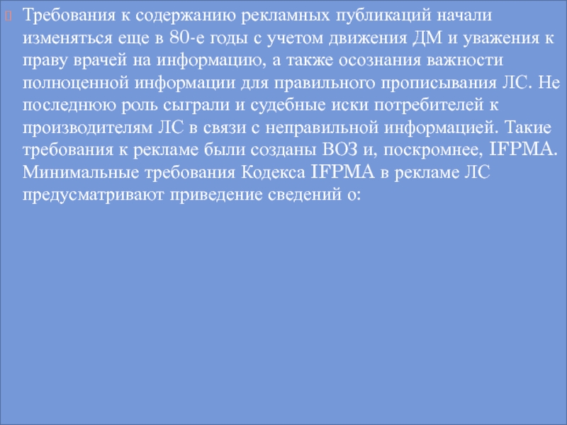 на информацию, а также осознания важности полноценной информации для правильного прописывания ЛС. Не последнюю роль сыграли и судебные иски потребителей к производителям ЛС в связи с неправильной информацией. Такие требования к рекламе были созданы ВОЗ и, поскромнее, IFPMA. Минимальные требования Кодекса IFPMA в рекламе ЛС предусматривают приведение сведений о: