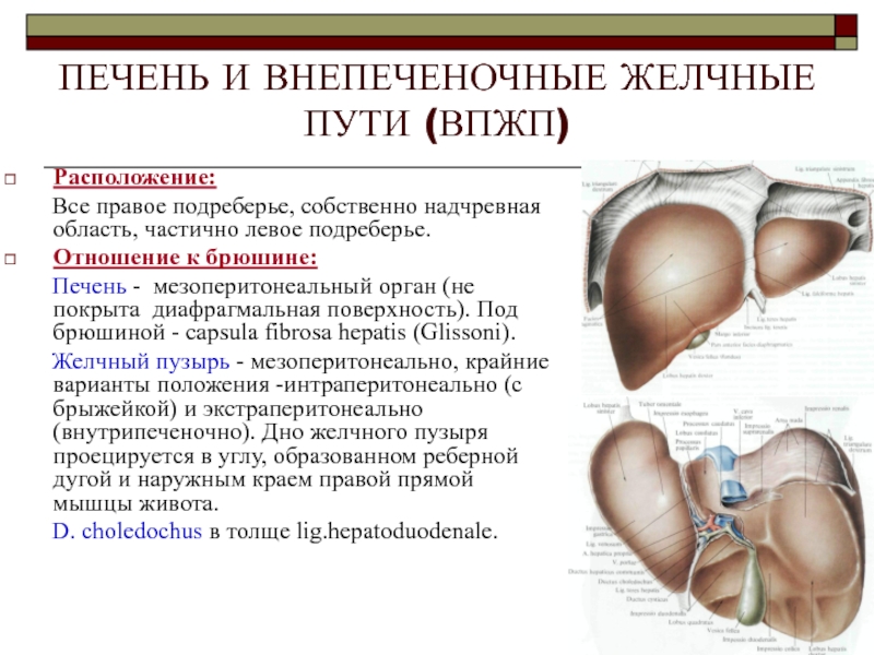 покрыта диафрагмальная поверхность). Под брюшиной - capsula fibrosa hepatis (Glissoni).Желчный пузырь - мезоперитонеально, крайние варианты положения -интраперитонеально (с брыжейкой) и экстраперитонеально (внутрипеченочно). Дно желчного пузыря проецируется в углу, образованном реберной дугой и наружным краем правой прямой мышцы живота.
