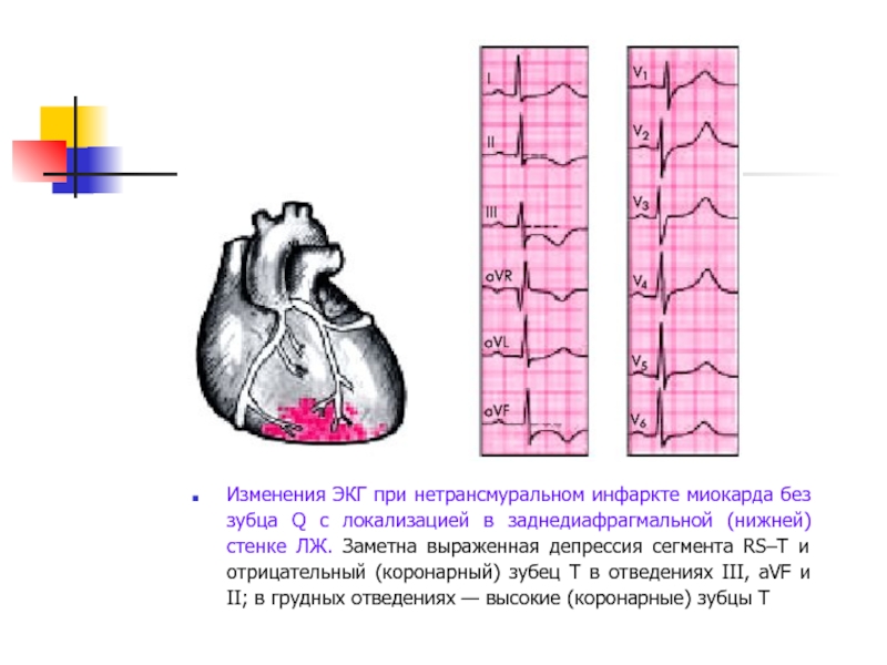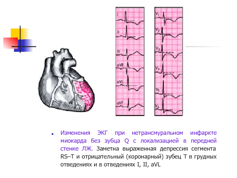 Слайд 37Изменения ЭКГ при нетрансмуральном инфаркте миокарда без зубца Q с