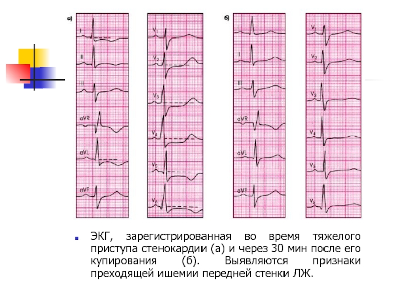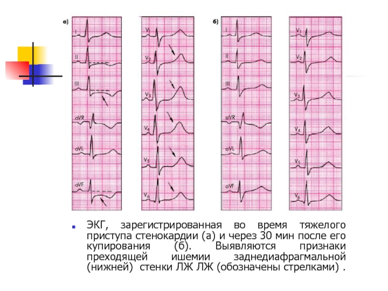 Слайд 8ЭКГ, зарегистрированная во время тяжелого приступа стенокардии (а) и через