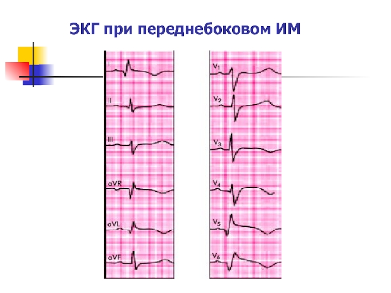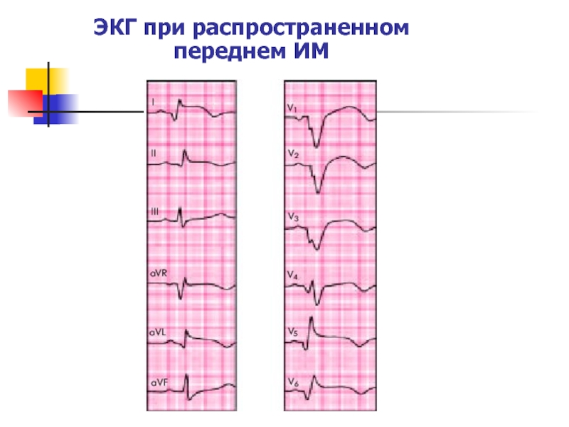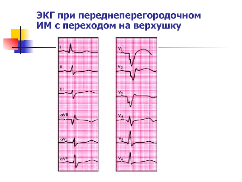 Слайд 22ЭКГ при переднеперегородочном ИМ с переходом на верхушку