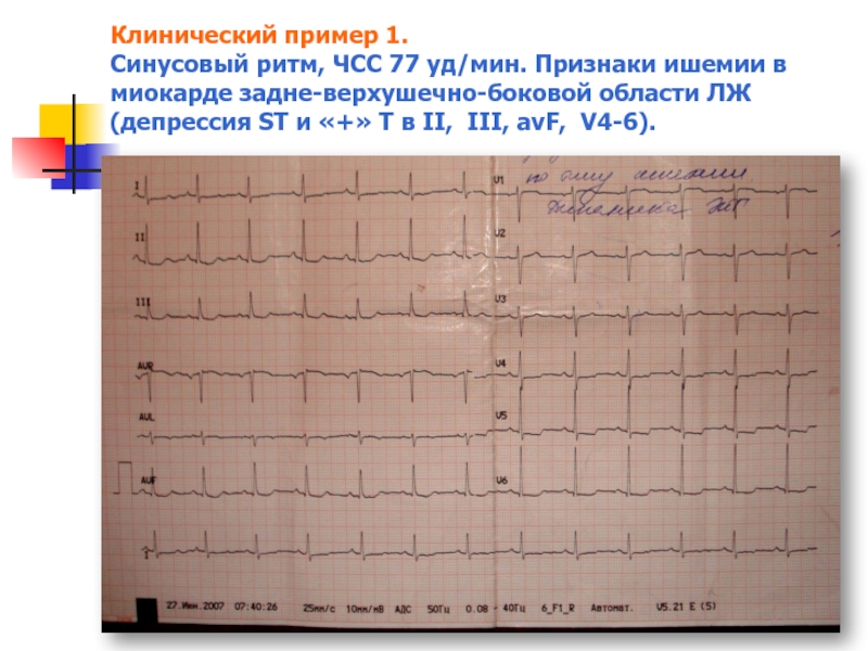 Синусовый ритм, ЧСС 77 уд/мин. Признаки ишемии в