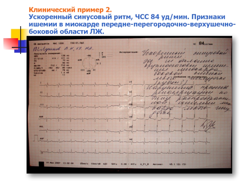 Ускоренный синусовый ритм, ЧСС 84 уд/мин. Признаки ишемии