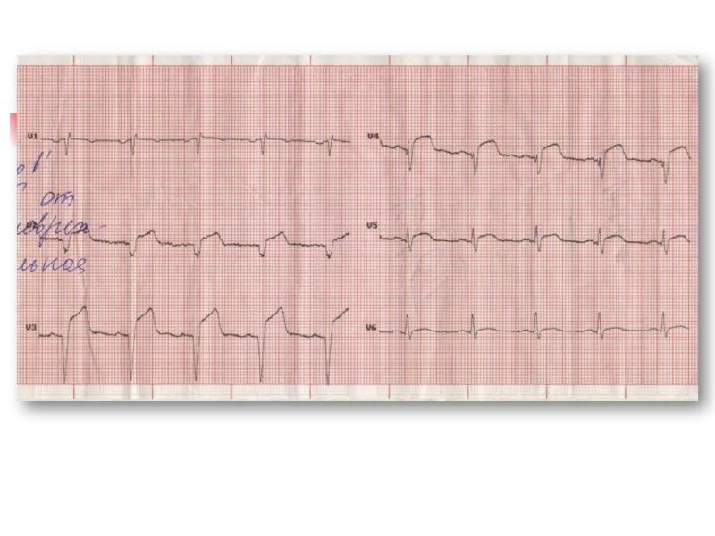 V4-6, депрессия ST и «» Т в I, avL, V4-6).