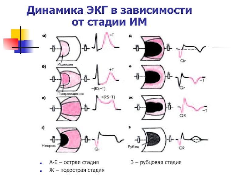 3. Зона ишемии — “коронарный” (равносторонний и остроконечный) зубец Т (высокий положительный при субэндокардиальном ИМ и отрицательный — при трансмуральном ИМ).