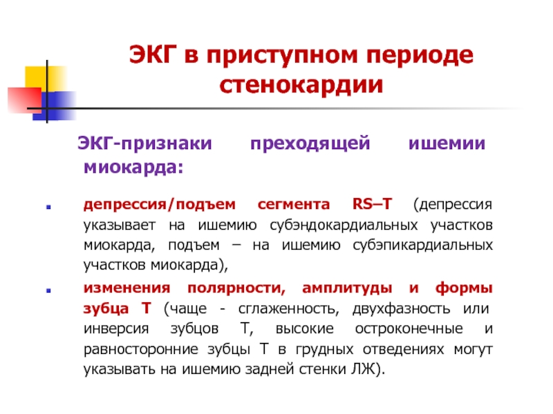 RS–Т (депрессия указывает на ишемию субэндокардиальных участков миокарда, подъем –
