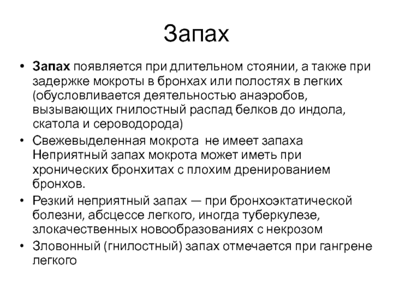 Резкий неприятный запах — при бронхоэктатической болезни, абсцессе легкого, иногда туберкулезе, злокачественных новообразованиях с некрозом
