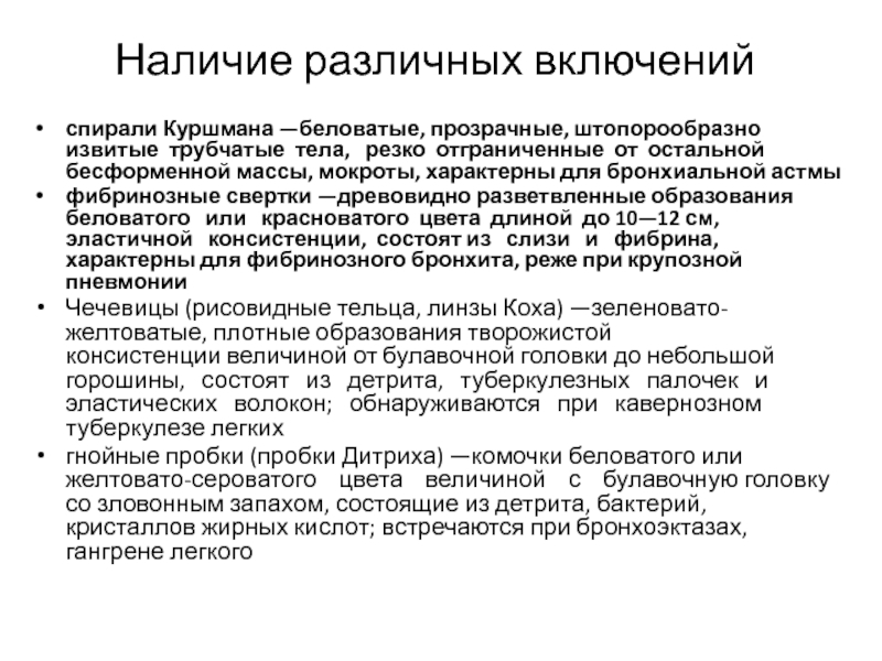 Спирали Куршмана—уплотненные закрученные в спираль образования из слизи, наблюдаются при легочной патологии, сопровождающейся бронхоспазмом (бронхиальная астма)