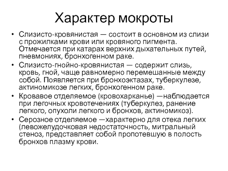 Слизисто-гнойно-кровянистая — содержит слизь, кровь, гной, чаще равномерно перемешанные между собой. Появляется при бронхоэктазах, туберкулезе, актиномикозе легких, бронхогенном раке.