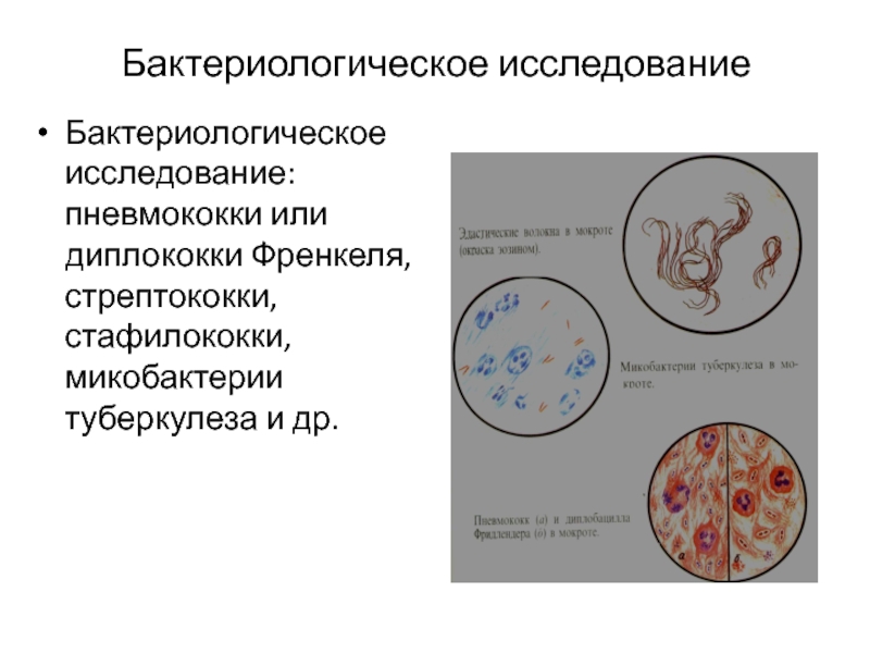 Бактериологическое исследование: пневмококки или диплококки Френкеля, стрептококки, стафилококки, микобактерии