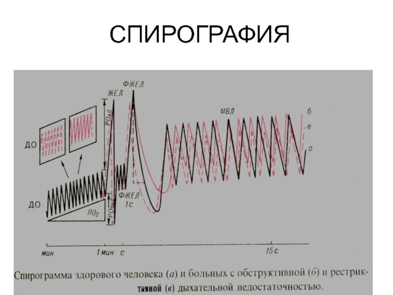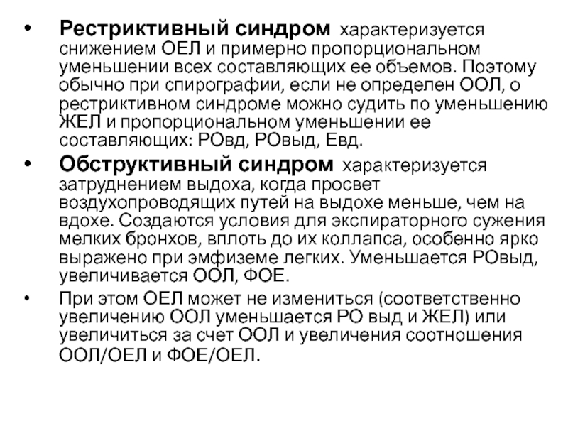 ООЛ, о рестриктивном синдроме можно судить по уменьшению ЖЕЛ и пропорциональном уменьшении ее составляющих: РОвд, РОвыд, Евд.