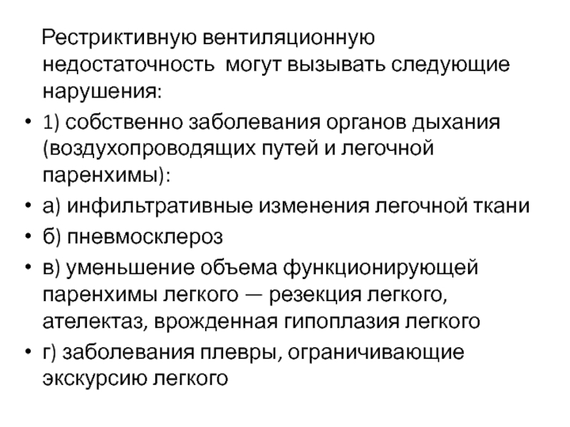 Слайд 26 Рестриктивную вентиляционную недостаточность могут вызывать следующие нарушения: