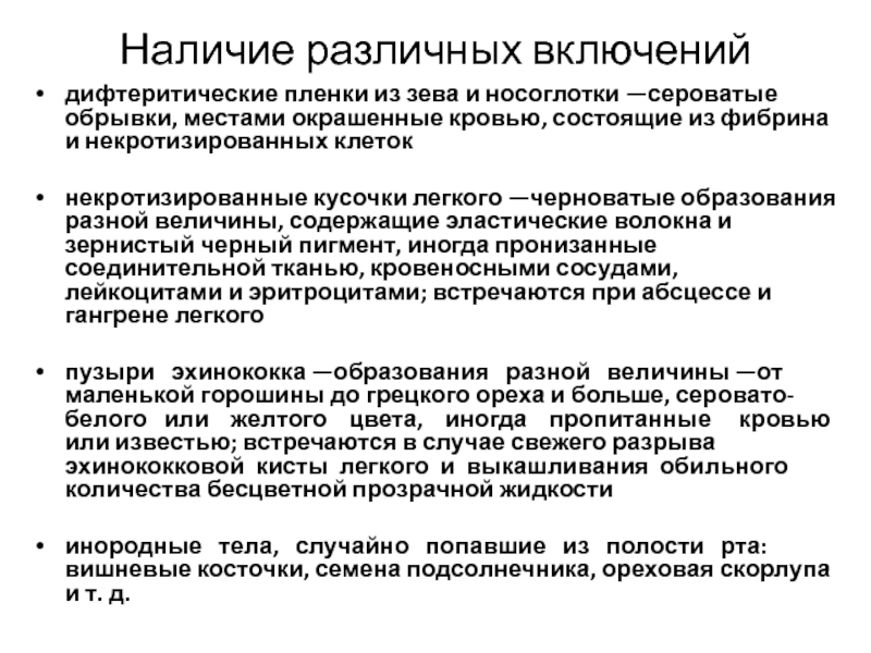 пузыри эхинококка —образования разной величины —от маленькой горошины до грецкого ореха и больше, серовато- белого или желтого цвета, иногда пропитанные кровью или известью; встречаются в случае свежего разрыва эхинококковой кисты легкого и выкашливания обильного количества бесцветной прозрачной жидкости