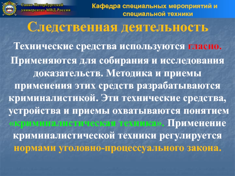Эти технические средства, устройства и приемы охватываются понятием «криминалистическая техника». Применение криминалистической техники регулируется нормами уголовно-процессуального закона.