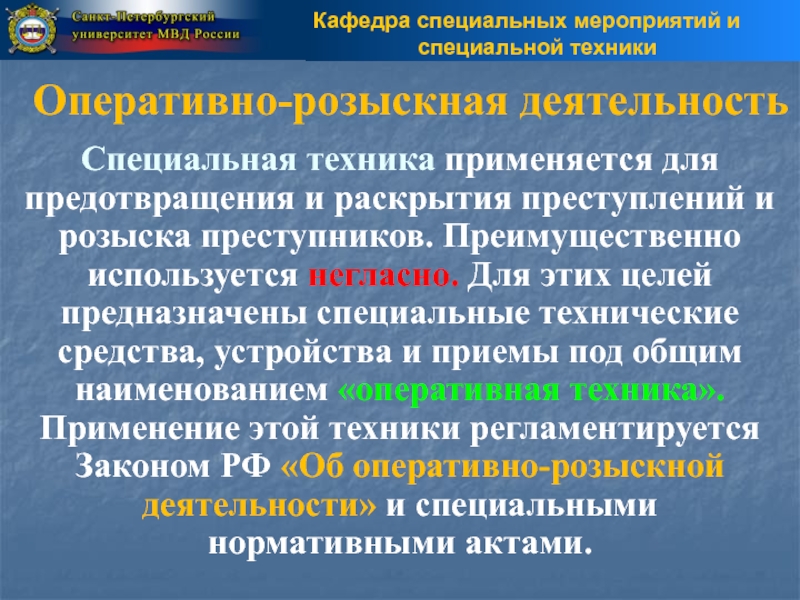 технические средства, устройства и приемы под общим наименованием «оперативная техника». Применение этой техники регламентируется Законом РФ «Об оперативно-розыскной деятельности» и специальными нормативными актами.