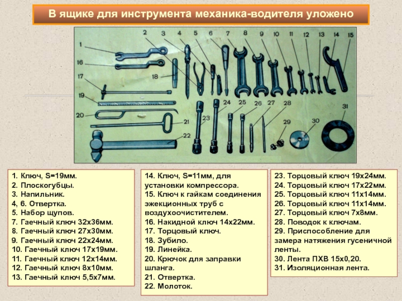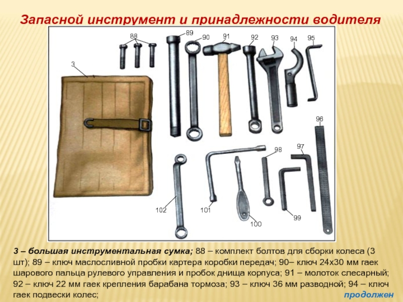 ключ маслосливной пробки картера коробки передач; 90– ключ 24х30 мм гаек шарового пальца рулевого управления и пробок днища корпуса; 91 – молоток слесарный; 92 – ключ 22 мм гаек крепления барабана тормоза; 93 – ключ 36 мм разводной; 94 – ключ гаек подвески колес;